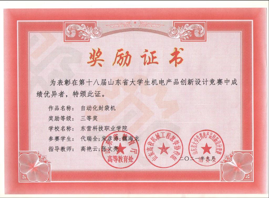 近日,第十八届(2021年)山东省大学生机电产品创新设计竞赛决赛成功举行。我校可以免费看的黄色网站学生代瑞全、宋彦涛、魏海龙的团队作品《自动化封袋机》荣获三等奖。