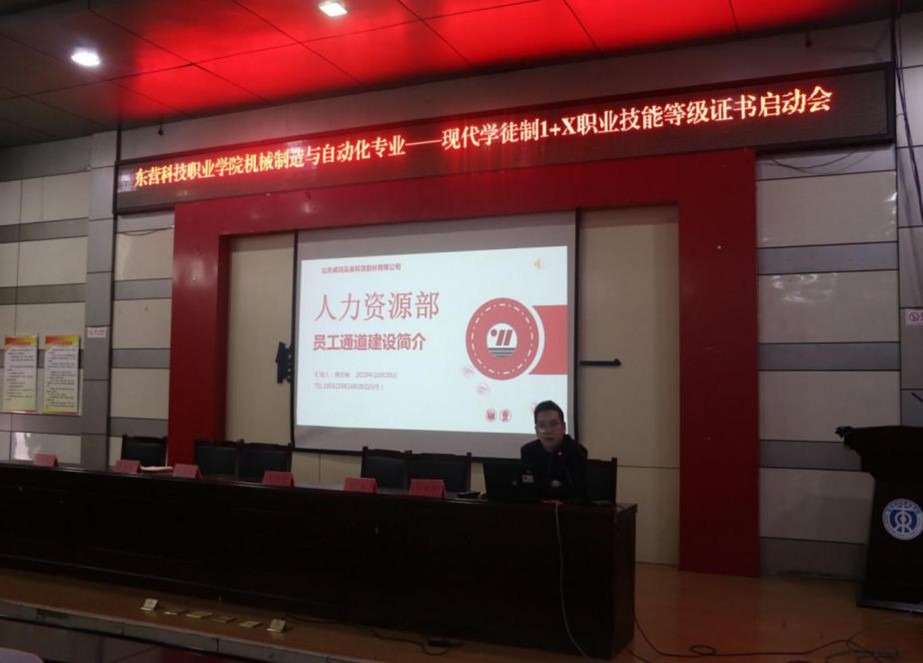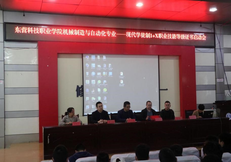2020年10月27日下午4点,东营科技职业学院机械制造与自动化专业——现代学徒制1+X职业技能等级证书启动会在我校一号报告厅举行。机电工程学院安丰金院长、朱建平老师、高艳云老师,烟台胜信科技,股份有限公司经理葛鹏、工程师王伟林,山东威玛石油有限公司人事总经理唐显骏,参加了此次启动会。