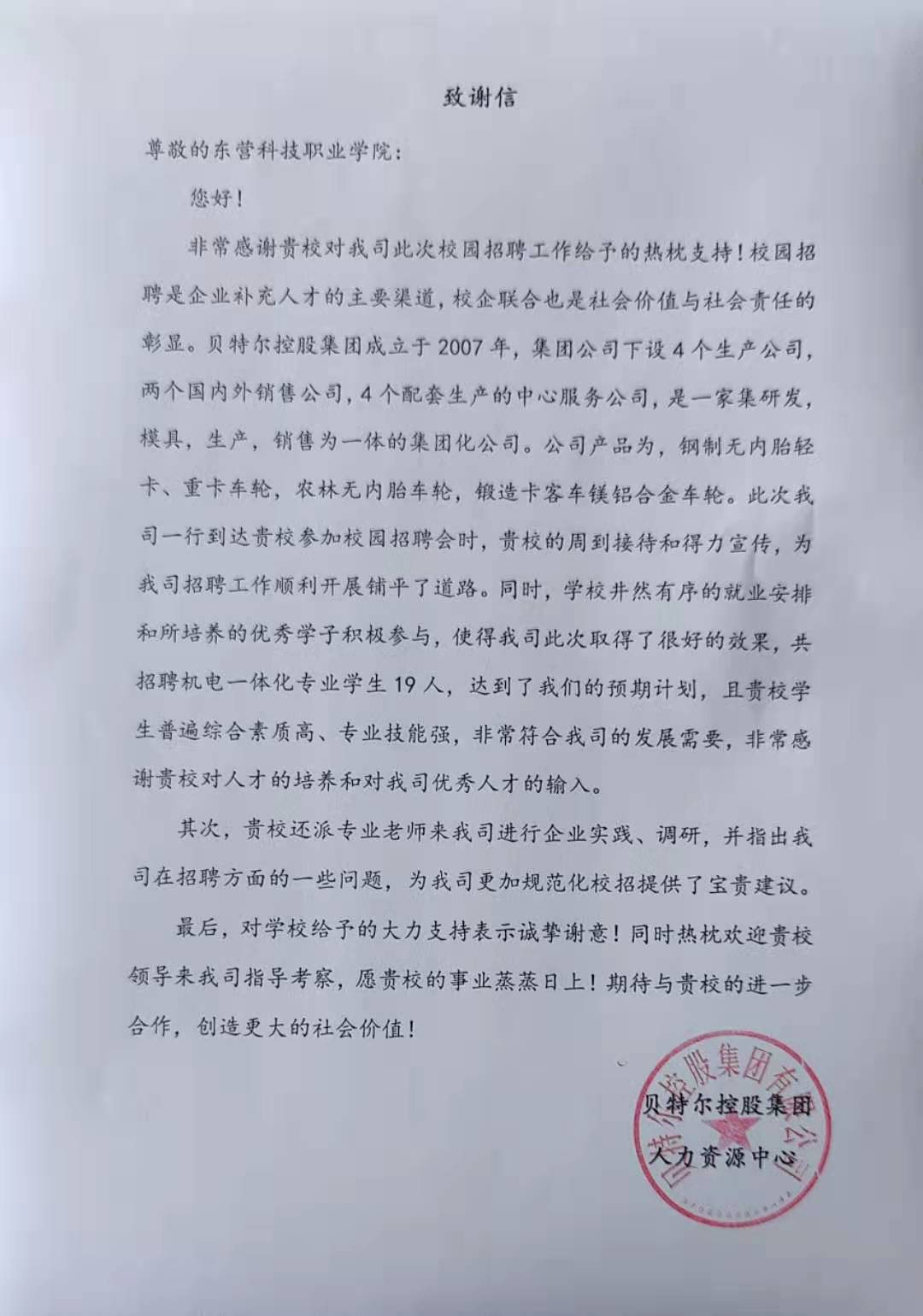 2021年8月12日我校收到来自贝特尔控股集团的致谢信,信中高度评价了我校18级机电一体化专业实习学生的表现,反应我校学生综合素质高,专业技能强,对我校老师的技能培养,学生的日常学习中给予了肯定,充分肯定了我院毕业生的专业能力、综合素质以及学生的创新精神。